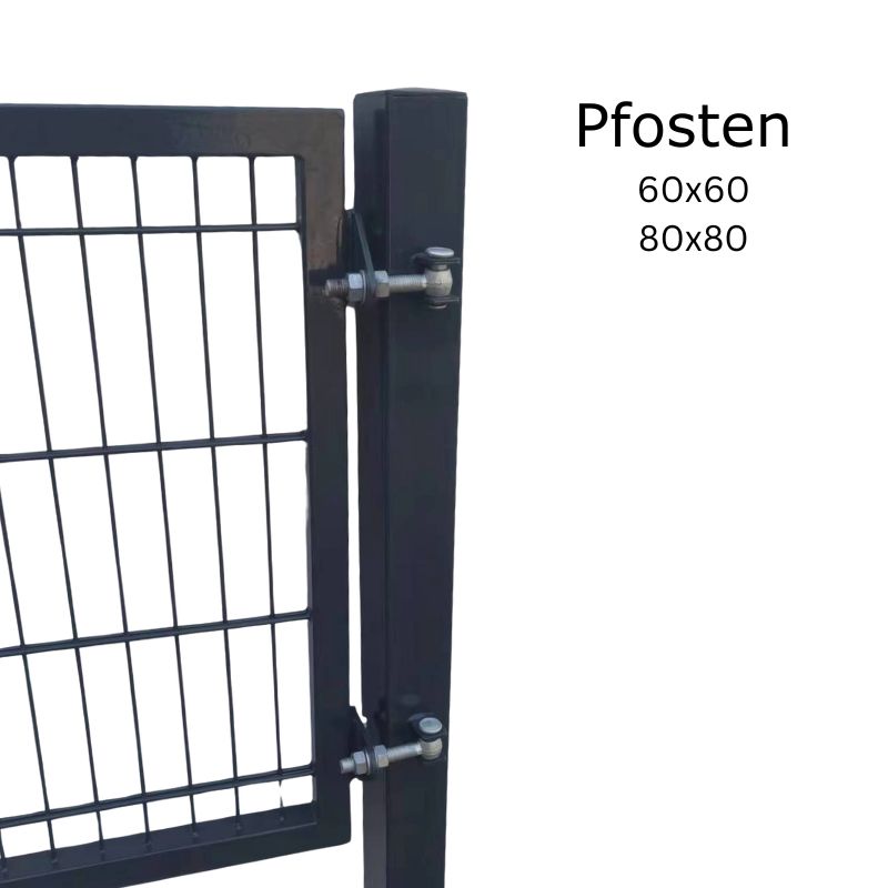Das Tor besteht aus einem umlaufenden Rohrrahmen (40x40mm), der zusätzliche Stabilität und Widerstandsfähigkeit gewährleistet. Die integrierte Doppelstabmatte mit einer Drahtstärke von 6/5/6mm und einer Maschenweite von 50x200mm sorgt für eine hohe Belastbarkeit und ein solides Erscheinungsbild. Die Torpfosten sind in den Maßen 50x50mm, 60x60mm oder 80x80mm erhältlich und bieten eine sichere Verankerung im Boden.