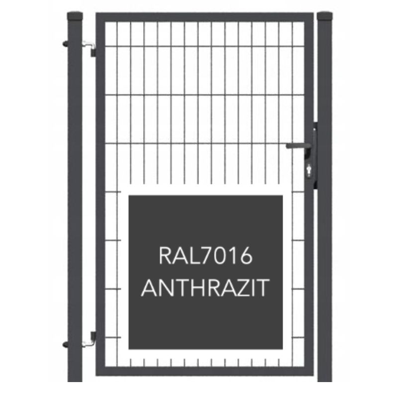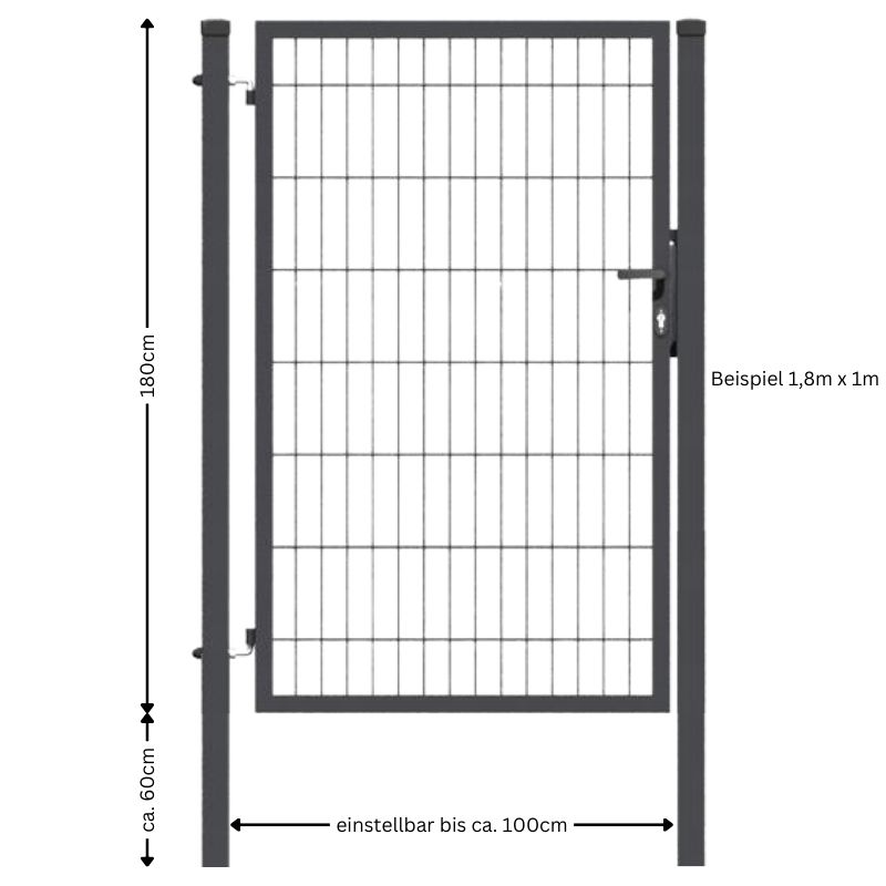 Das Tor ist mit einem Einsteckschloss und Drückergarnitur ausgestattet, die eine einfache Handhabung ermöglichen. Unser Doppelstabmattentor zeichnet sich durch seine Flexibilität aus. Sie können die Torhöhe nach Ihren Bedürfnissen im Bereich von 1000mm bis 1800mm wählen und die Öffnungsrichtung des Tores frei wählen. Das variable Türanschlag- und Schlosssystem ermöglicht standardmäßig eine Öffnungsrichtung von 90°, was eine optimale Anpassung an Ihre Gegebenheiten gewährleistet. Das Tor ist in verschiedenen Oberflächenoptionen erhältlich, darunter die verzinkte Ausführung die jeweils mit einer Pulverbeschichtung nach RAL 6005 in moosgrün oder nach RAL 7016 in anthrazitgrau kombiniert werden kann. Dadurch erhalten Sie nicht nur ein optisch ansprechendes Tor, sondern auch eine hervorragende Korrosionsbeständigkeit für eine lang anhaltende Haltbarkeit.