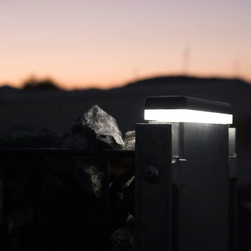 Ein Aluminiumgehäuse trifft auf UV-beständiges Polycarbonat - dazwischen jede Menge Licht. Montiert wird die beleuchtete Pfostenkappe mittels einer Feder an dem Zaunpfosten. Sowohl Neu- als auch Bestandsanlagen können mit der Zaunbeleuchtung ausgestattet werden.