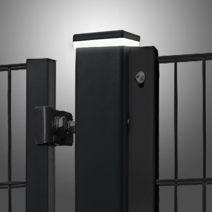 Ein Aluminiumgehäuse trifft auf UV-beständiges Polycarbonat - dazwischen jede Menge Licht. Montiert wird die beleuchtete Pfostenkappe mittels einer Feder an dem Zaunpfosten.
